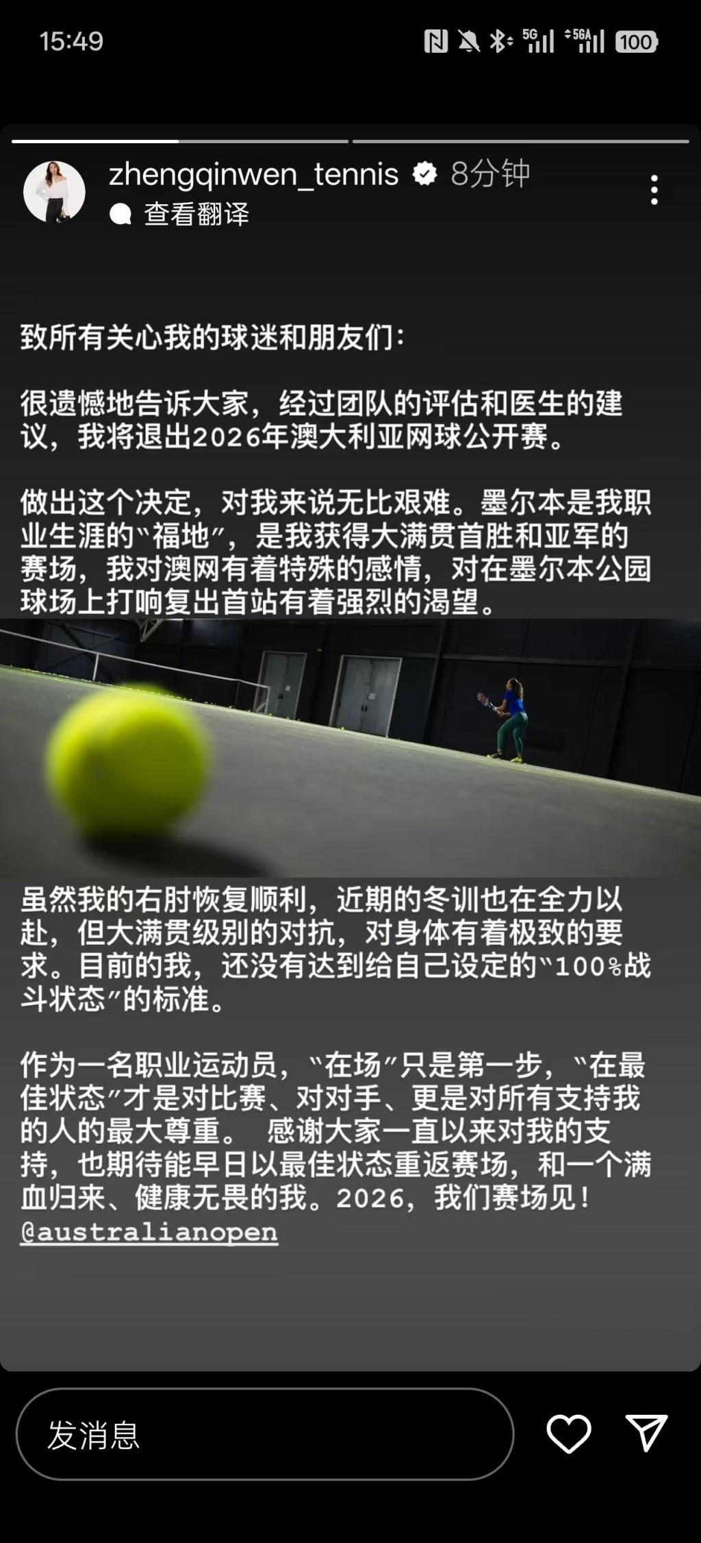 郑钦文在社交媒体上表示:“致所有关心我的球迷和朋友们,很遗憾地告诉大家,经过团队的评估和医生的建议,我将退出2026年澳大利亚网球公开赛。”